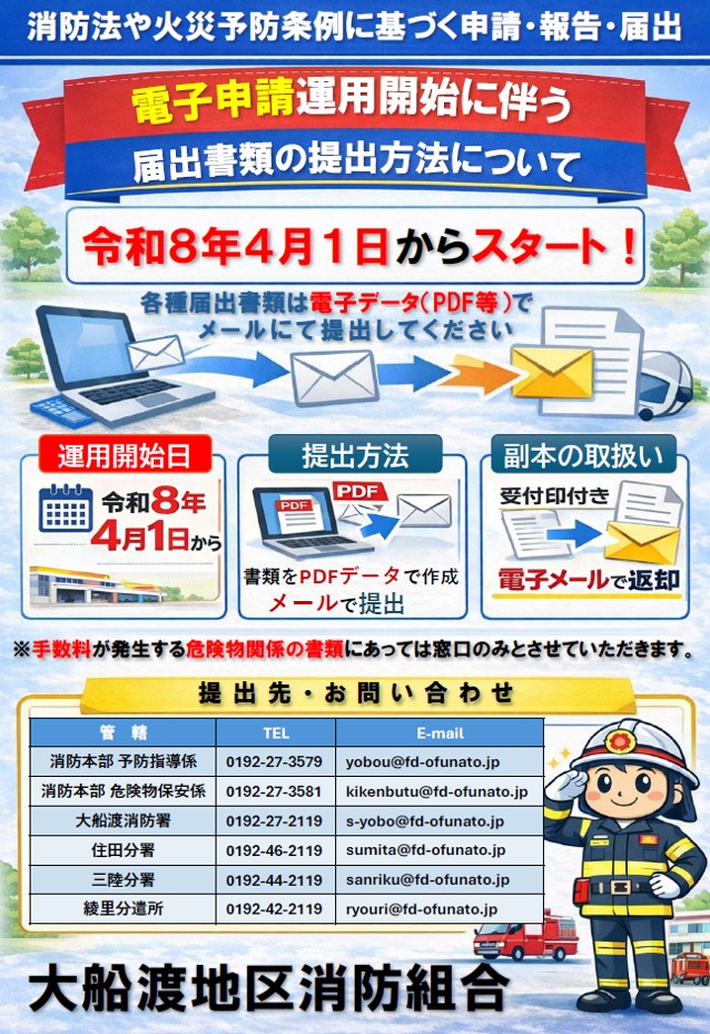 電子メールによる提出方法 大船渡地区消防組合では、令和5年4月から消防法や火災予防条例に基づく申請書・報告書・届出書等(以下「申請書等」という。)の電子メールによる受付を行っています。